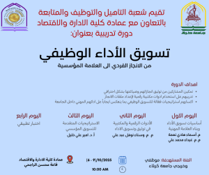 تقيم شعبة التأهيل والتوظيف والمتابعة بالتعاون مع كلية الادارة والاقتصاد دورة تدريبية بعنوان (تسويق الأداء الوظيفي: من الانجاز الفردي الى العلامة المؤسسية) ابتداءً من يوم الاثنين الموافق (2025/10/6) و لمدة 4 ايام.